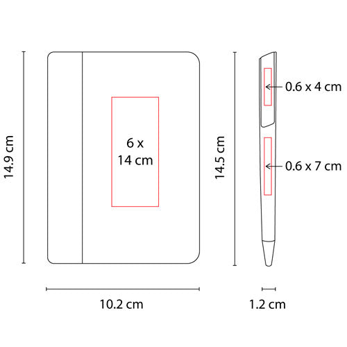 Área de impresión: 6 x 14 cm Libreta / 0.6 x 7 cm Barril / 0.6 x 4 cm Clip